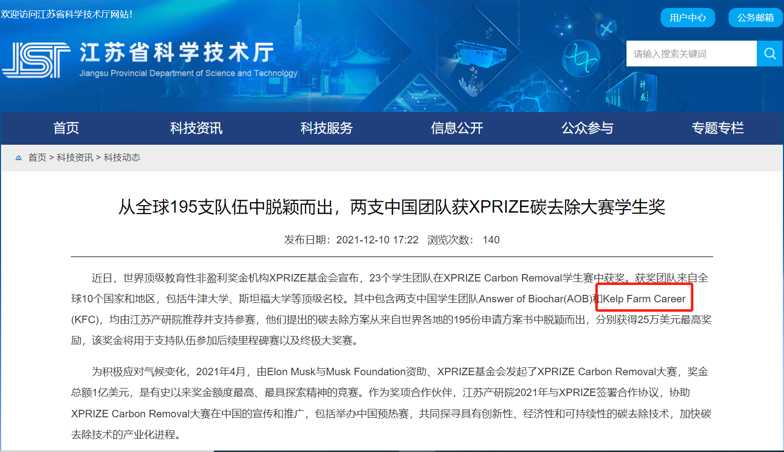 图3 Kelp-Farm-Career团队获江苏省科技厅官网报道